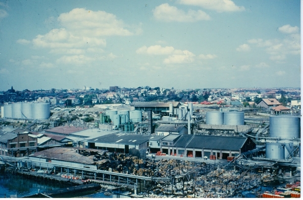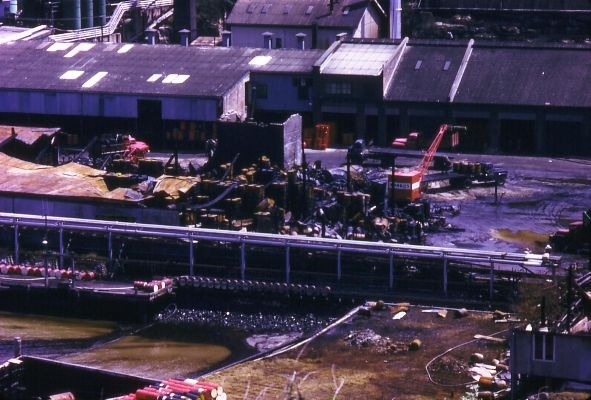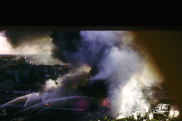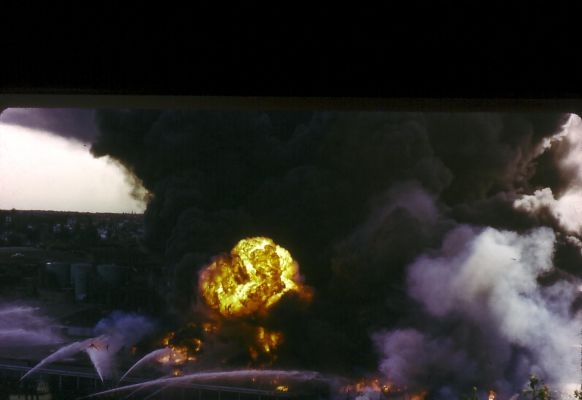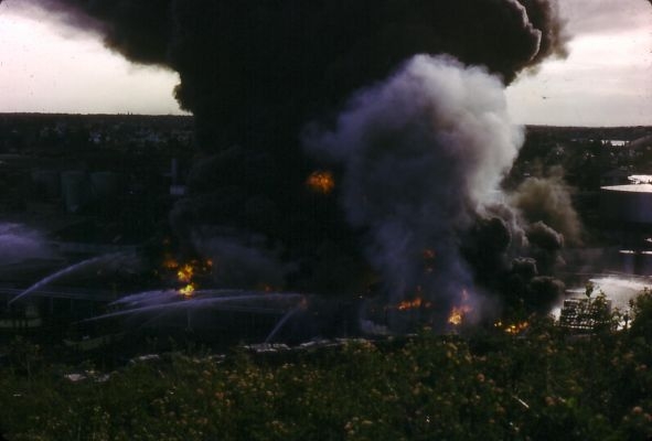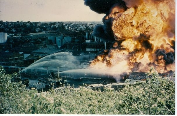 The fire at the Pulpit Point storage depot occurred on the 27th October 1964, and began when oil was being loaded into drums. Firemen struggled among millions of gallons/litres of stored fuel, to put out the blaze at the source, with ominous questions like; would the thousands of 44 gallon drums that were exploding in the fire set off the main storage tanks and would they send a spray of blazing fuel over the adjacent homes.